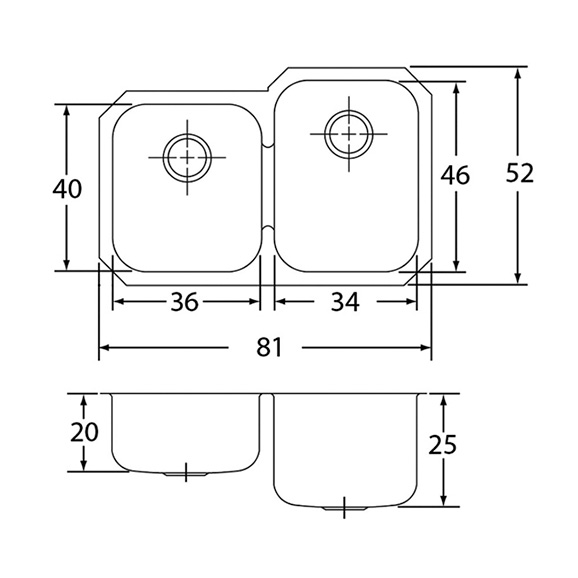 Tarja de submontar, línea elumina eb, tina 1 34 x 46 cm y profundidad 25 cm, tina 2 36 x 40 cm y profundidad 20 cm, de acabado satinado.